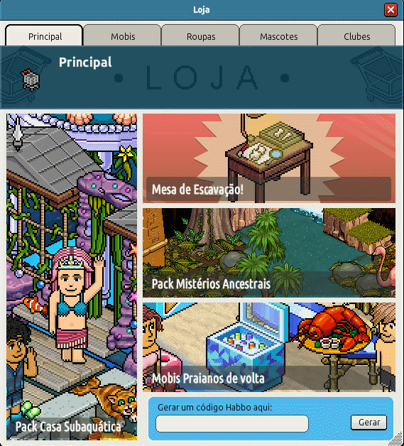 Na manhã desta segunda-feira (25/07) está de volta ao catálogo, com algumas alterações nas mobílias envolvidas, a nova organização deste pack ao estilo aquático para que seu quarto reproduza as belezas contidas nas profundezas do oceano que cerca o hotel. Além disso, o pack acompanha um emblema exclusivo. Ele pode ser adquirido por 90 câmbios + 90 diamantes ou 199 câmbios. Saiba como adquirí-lo abaixo: