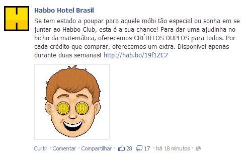 Além de ganhar emblemas na compra de quartos pré definidos (Battle Banzai, Freeze e Wired's), que virou rotina nas campanhas do Habbo, você ainda vai poder ganhar créditos (moedas) em dobro perante a compra. Isso tudo é o que mostra os códigos...