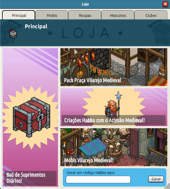 Este mês está cheio de novidades e como sabemos, diversas coisas são hospedadas no hotel, tratando-se de roupas, raros, entre outras coisas. Para a campanha de agosto, Vilarejo Medieval, chegaram ao catálogo os novos Baús de Suprimentos Diários, que como o próprio nome já diz, entregará suprimentos, os quais podem ser usados para realizar criações dos belíssimos visuais medievais. Ele será disponibilizado na loja algumas vezes ao longo do mês e pode ser adquirido por 4 câmbios + 10 diamantes. Confira mais informações abaixo: