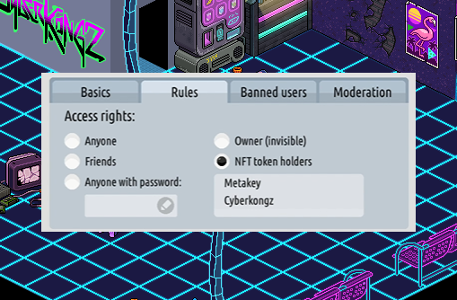 "No final desta semana (acreditamos que seja amanhã), você vai poder bloquear o acesso a quartos com base na propriedade de um NFT, ou seja, você vai poder controlar quem entra no seu quarto com base no NFT que possui! Para utilizar esse recurso, isso quando for lançado, tudo o que você precisa fazer é: