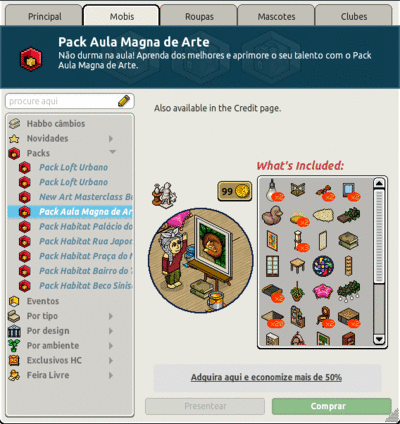 Nesta segunda-feira (19 de Setembro de 2022), retornou ao catálogo do Habbo Hotel o Pack Aula Magna de Arte, que ficará disponível até o dia 26 de Setembro (segunda-feira). O quarto completo pode ser adquirido por 99 câmbios, 45 câmbios + 45 diamantes ou R$ 18,90 na HabboShop. O Pack acompanha um emblema exclusivo e muitos mobis. Confira!