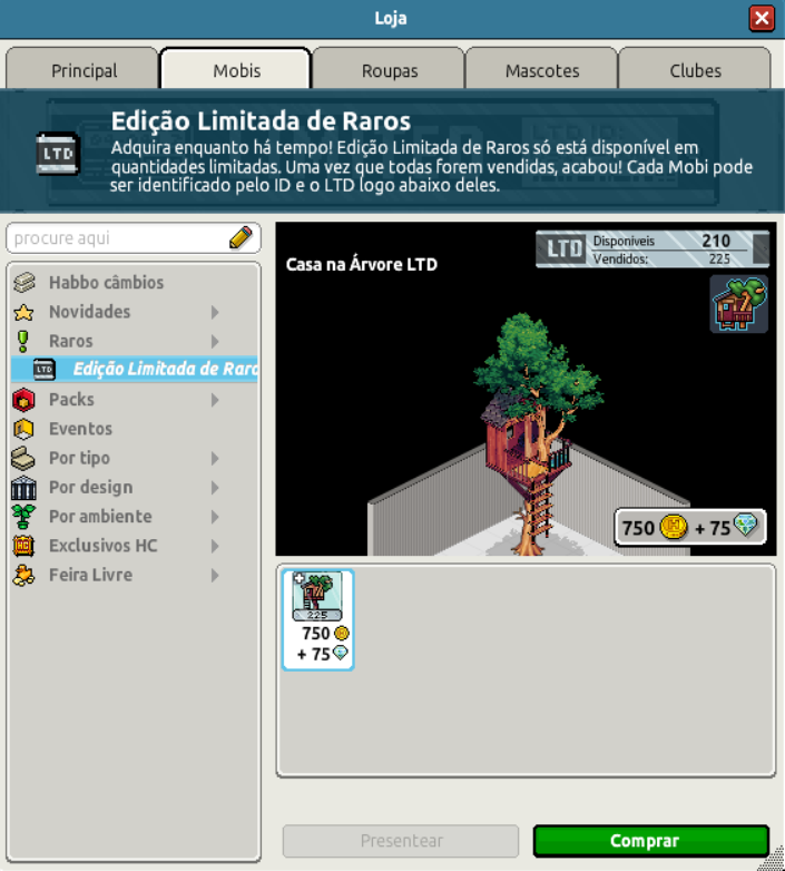 Nesta terça-feira (27 de setembro de 2022), chegou ao catálogo do Habbo Hotel um novo Raro LTD. O raro LTD Casa na Árvore estará disponível entre o dia 27 de setembro e 1 de outubro, até às 8h BR / 12h PT. Ele tem o valor de 750 câmbios + 75 diamantes, e vem acompanhado de um emblema exclusivo para quem o adquirir. Confira todas as informações: