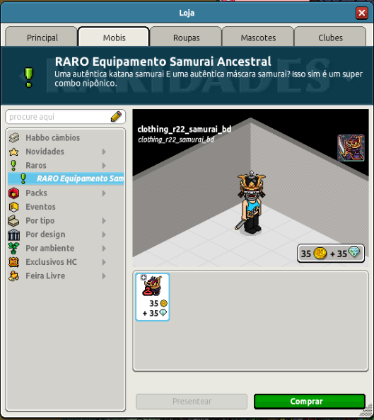Você que gosta de se vestir como um samurai, tenho uma novidade para você! Um novo raro com esse tema foi lançado na loja do Habbo! Gostou da novidade? Um raro completo, com máscara e espada!