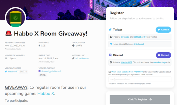 - O ganhador do sorteio receberá o quarto por meio do airdrop depois do lançamento público que será no mês de dezembro. Para isso, fique sempre atento ao Discord e no Twitter do HabboNFT para não perder nada!