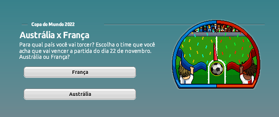 Amanhã, dia 22/11/2022 às 16h BR / 19h PT teremos mais um jogo da Copa do Mundo, e os times a entrarem em campo, serão Austrália e França, e o nosso querido Habbo Hotel liberou mais uma votação valendo emblema!