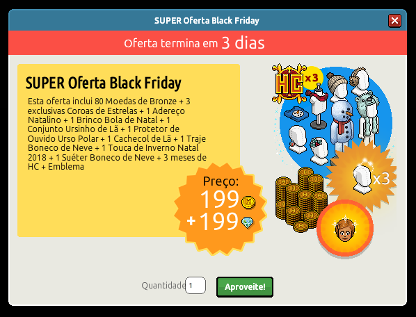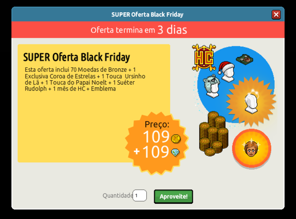 Novembro é mês de black friday, e no Habbo, não seria diferente! Nova oferta já está disponível! Você já poderá garantir essa nova oferta! Poderá comprar HC, moedas, acessórios e roupas!