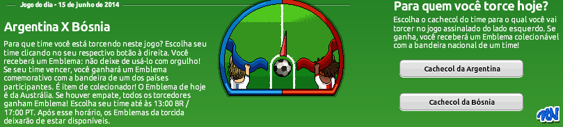 Hoje, há poucos minutos, foi atualizado e colocado uma novo palpite para que você possa escolher o time vencedor. Agora, a disputa é entre Argentina X Bósnia. Quem será que vence ? Veja a explicação abaixo de como conseguir um emblema: