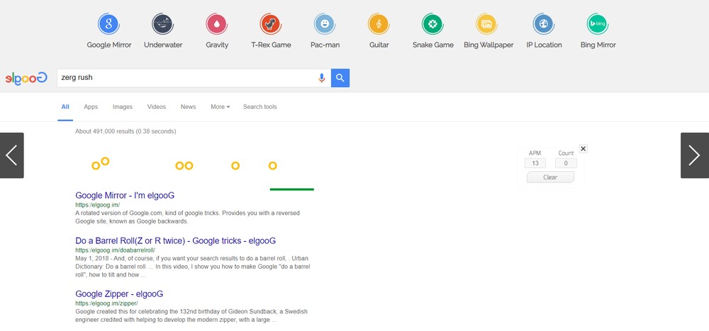 O jogo Zerg Rush foi adicionado à lista de easter eggs do Google em 2012 e está disponível até hoje para aqueles que querem se divertir sem sair do navegador. Para ativar o game escondido, basta pesquisar por "Zerg Rush" e selecionar o primeiro link da lista de resultados.