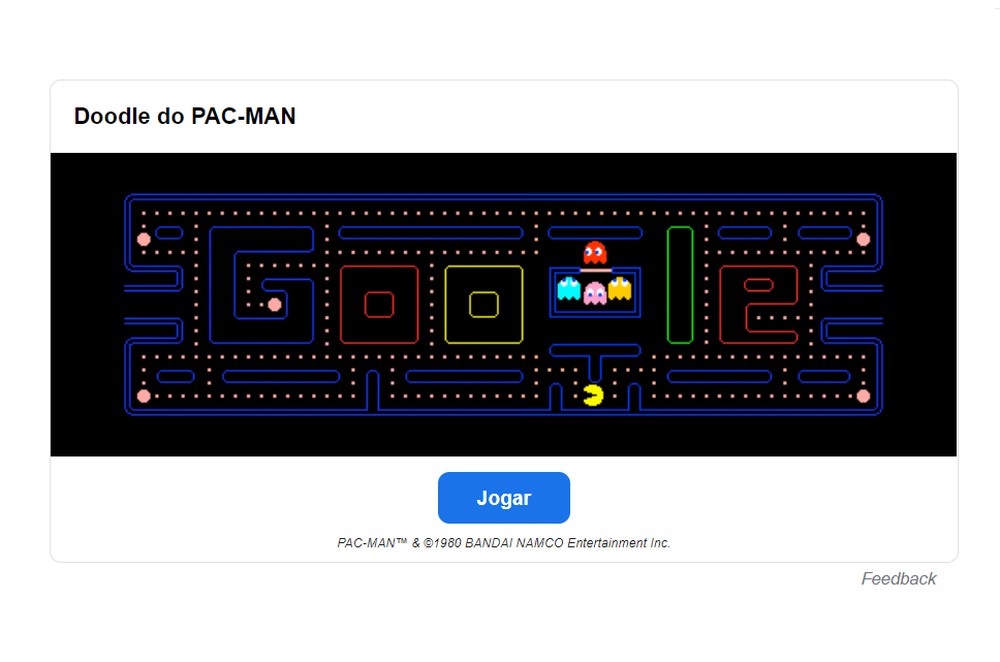 O clássico Pac Man também está incluso em um dos joguinhos secretos do Google. O mascote amarelo, rechonchudo e guloso da Namco, foi um dos maiores marcos na história dos videogames nos anos 1980 e faz sucesso até hoje. Para reviver a experiência do jogo sem sair do navegador, basta buscar por "pac-man".