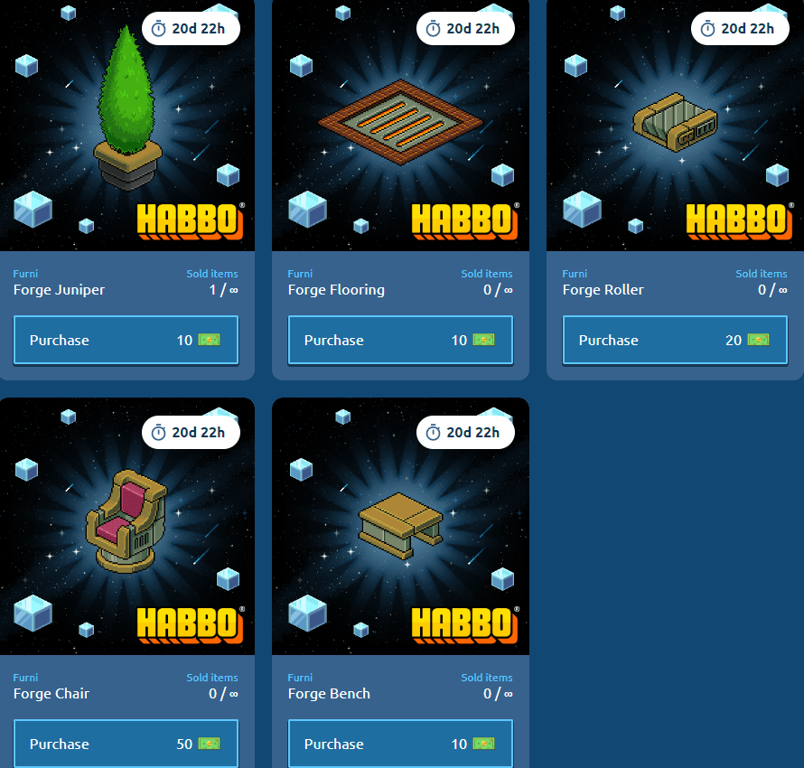 "Esses itens não estarão sendo vendidos dentro do Habbo, são do projeto Habbo NFT. Você deve acessar a página "Shop" para conferir os mobis: https://nft.habbo.com/credits/?tab=shop."