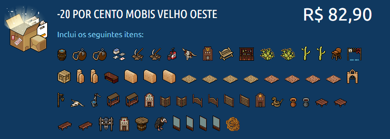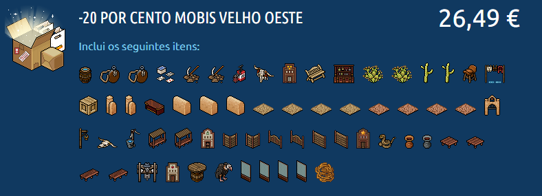 O Habbo Hotel BR/PT, na manha desta quinta-feira (30/03), disponibilizou na loja oficial de vendas de moedas do jogo, uma nova promoção. A promoção traz contigo, -20% de desconto nos Mobis Velho Oeste. A promoção contém 62 mobis e pode ser adquirido por R$ 82,90 BR ou 26,49 €. Confira mais informações: