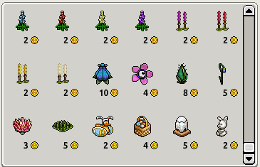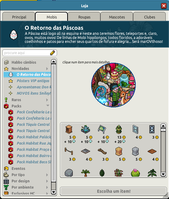Na manhã desta sexta-feira (31/03), o Habbo Hotel Luso Brasileiro, disponibilizou novamente para os usuários a coleção de Páscoa Habbo. A coleção traz diversos mobis nostálgicos, que não ficam disponíveis para os usuários no dia a dia, apenas em campanha. Os mobis podem ser adquiridos até 01 de maio. Confira toda coleção abaixo: