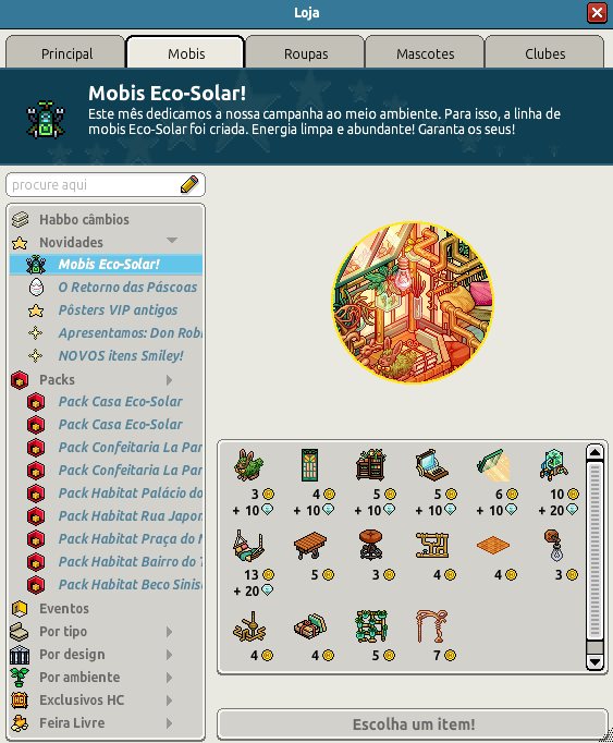 No mês de abril, o Habbo Hotel BR/PT vai dedicar a campanha ao meio ambiente com mobis, emblemas com relação ao tema escolhido para o mês. O tema escolhido para celebrar o meio ambiente foi "Eco-Solar". Hoje (03/04) pela parte da manhã, o Habbo Hotel disponibilizou para os usuários os mobis da coleção "Eco-Solar". Confira: