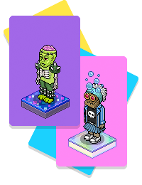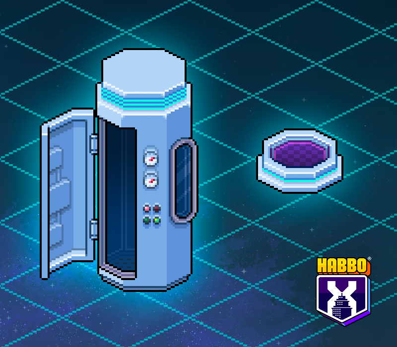 • Teleporte Habbo X (à direita) poderá ser reivindicado GRATUITAMENTE em https://nft.habbo.com/shop por qualquer pessoa com um Habbo Avatar ou um Quarto do Habbo X. É um par de teletransportes por avatar ou quarto, portanto, se você tiver 4x avatares e 2x quartos, poderá reivindicar 6x pares de teletransportes.