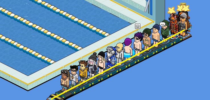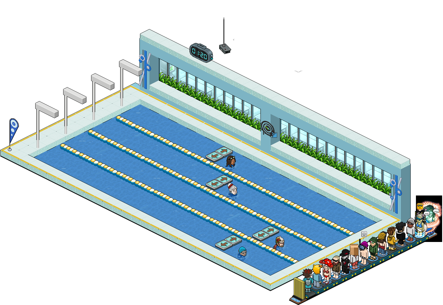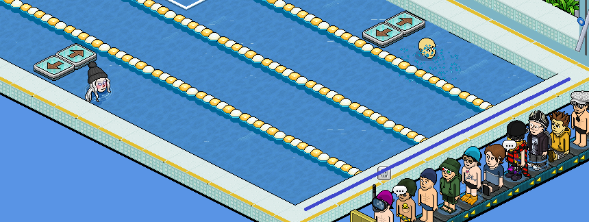 Nesse mês de julho, o Habbo Hotel está em clima de olimpíadas, disponibilizando campanhas com emblemas, tarefas e também mobs disponibilizados no catálogo do jogo. Na manhã desta quarta-feira (31/07), mais um emblema foi disponibilizado para os usuários da comunidade brasileira e portuguesa. O jogo é uma espécie de piscina olímpica, você deverá chegar ao outro lado da piscina antes dos seus adversários. Confira o tutorial e saiba como conquista-lo.