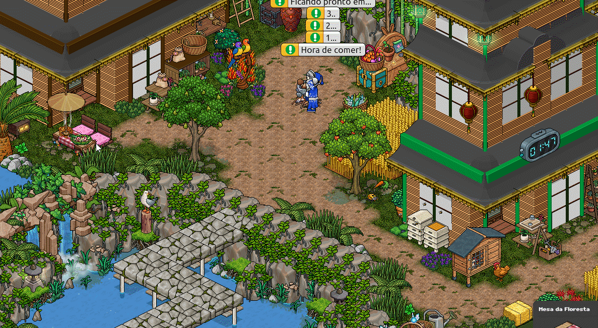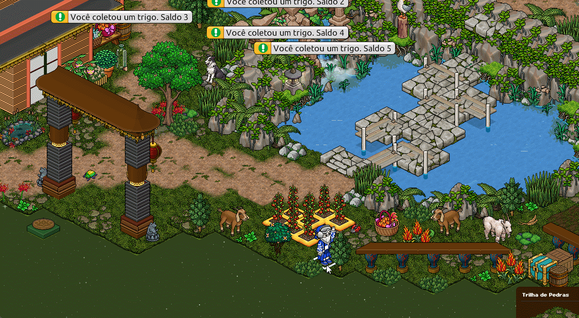 Na primeira etapa, você deverá coletar 5 cereais. Para coletar, caminhe até o cereal que aparecerá em um lugar aleatório e acene (use o comando o/ para facilitar).