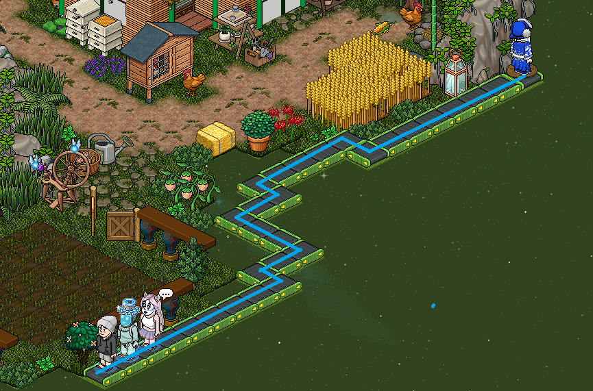 Na terceira etapa, vá até o regador e digite * para pegá-lo. Em seguida, caminhe sobre os seis 'Pisos de Plantação' para regá-los.