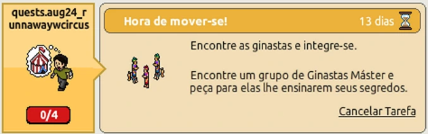 Desde o início de agosto, o Habbo está em clima circense, oferecendo uma variedade de coleções de mobis, itens de vestir, emblemas e tarefas para toda a comunidade brasileira e portuguesa. Na noite desta quinta-feira (22/08), o Habbo Hotel disponibilizou a quinta tarefa circense. As tarefas anteriores ainda estão acessíveis ao público. Confira abaixo como completar a nova missão e garantir suas recompensas!