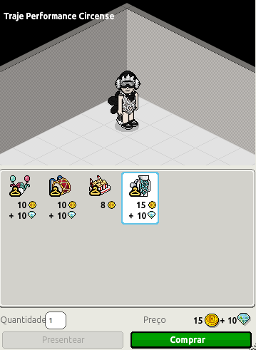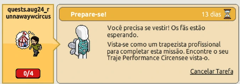 2° Passo / Tarefa 1: Nesta tarefa, você deverá comprar e usar o Traje Performance Circense para concluir a tarefa. A mesma está disponível no catálogo por 15 câmbios + 10 diamantes.
