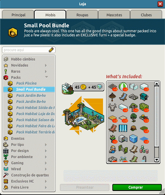 Nesta Quinta-feira (29/08), foi disponibilizado no catálogo do Habbo Hotel Luso Brasileiro o Pack Piscina. Os usuários podem adquiri-lo por 45 câmbios + 45 diamantes ou 99 câmbios. O pack também está disponível no Habbo Shop por R$ 24,99 ou 5,49 €. Além disso, inclui um emblema exclusivo.