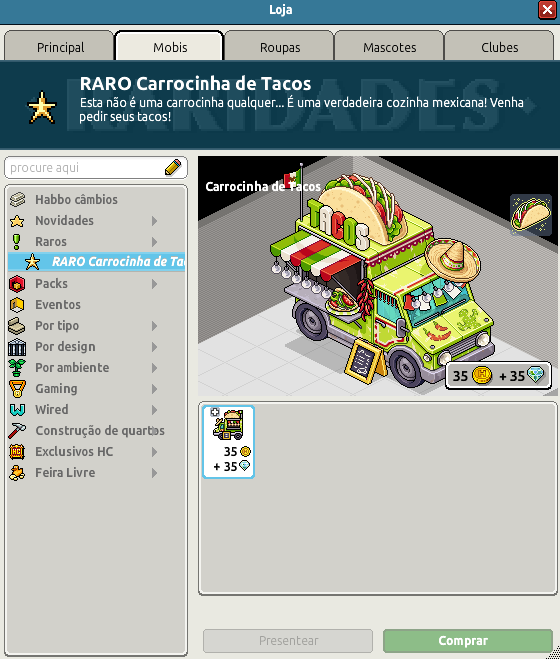 Na manhã desta Sexta-feira (06/09), foi lançado no catálogo do Habbo Hotel Luso Brasileiro o Raro Carrocinha de Tacos. O item pode ser adquirido por 35 câmbios + 35 diamantes e inclui um emblema exclusivo. Aproveite, pois o Raro estará disponível no catálogo por tempo limitado!