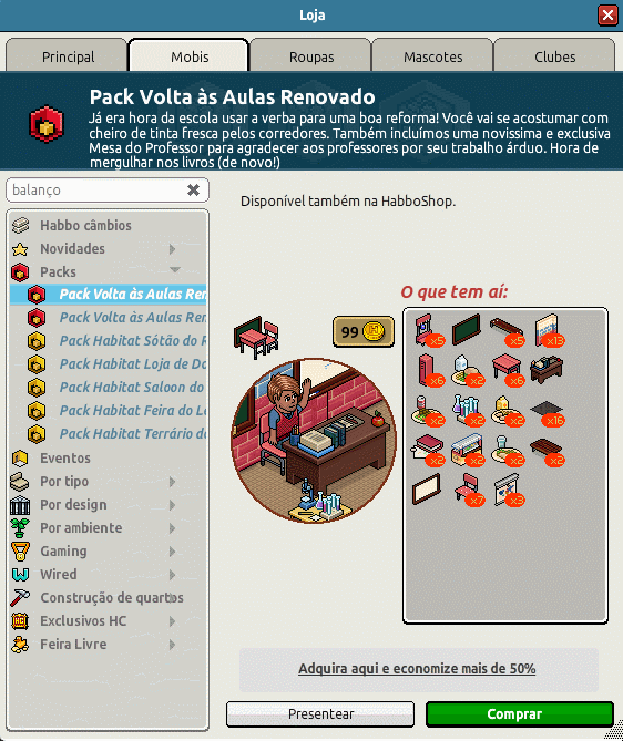 Nesta Segunda-feira (09/09), foi disponibilizado no catálogo do Habbo Hotel Luso Brasileiro o Pack Volta às Aulas Renovado. Os usuários podem adquiri-lo por 45 câmbios + 45 diamantes ou 99 câmbios. O pack também está disponível no Habbo Shop por R$ 24,99 ou 5,49 €. Além disso, inclui um emblema exclusivo.