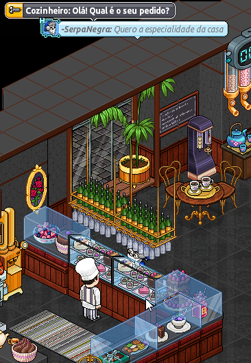 1ª Etapa: Você deverá caminhar até na frente do balcão e dizer "Quero a especialidade da casa" e aguarde a resposta do BOT.