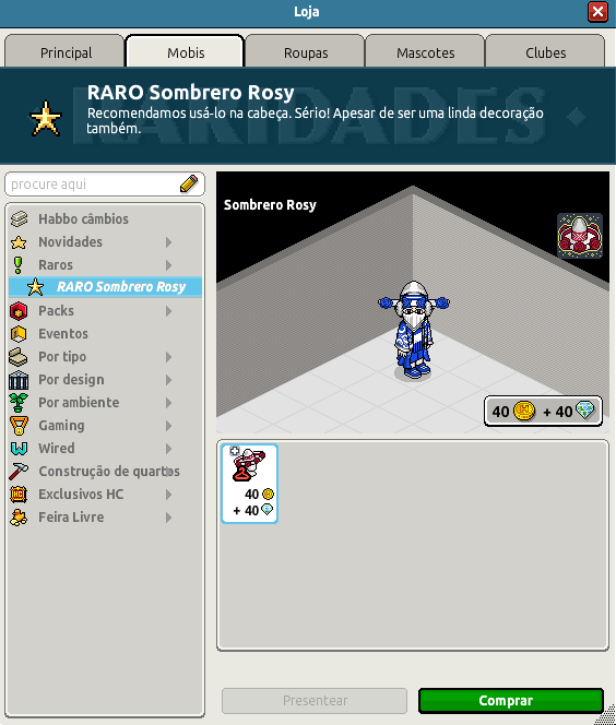 Na manhã desta Sexta-feira (27/09), foi lançado no catálogo do Habbo Hotel Luso Brasileiro o Raro Sombrero Rosy. O item pode ser adquirido por 40 câmbios + 40 diamantes e inclui um emblema exclusivo. Aproveite, pois o Raro estará disponível no catálogo por tempo limitado!