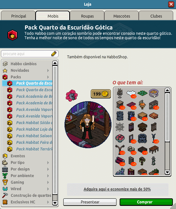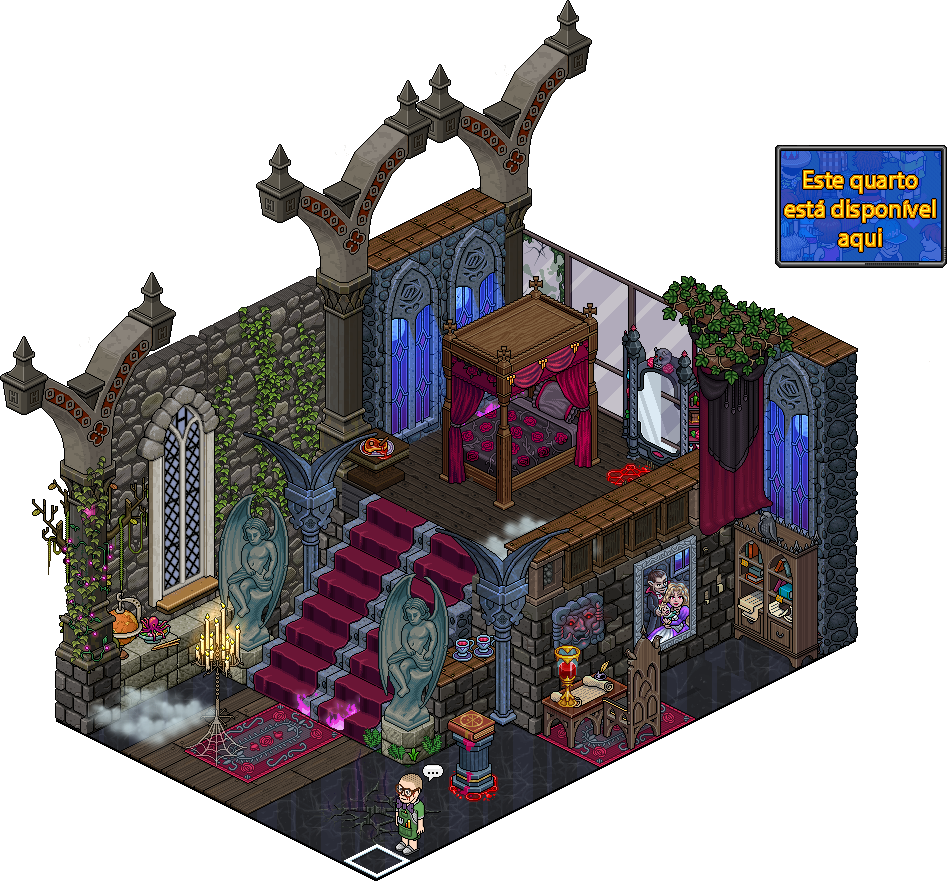 Nesta Segunda-feira (15/10), foi disponibilizado no catálogo do Habbo Hotel Luso Brasileiro o Pack Quarto da Escuridão Gótica. Os usuários podem adquiri-lo por 90 câmbios + 90 diamantes ou 199 câmbios. O pack também está disponível no Habbo Shop por R$ 49,99 ou 10,99 €. Além disso, inclui um emblema exclusivo.